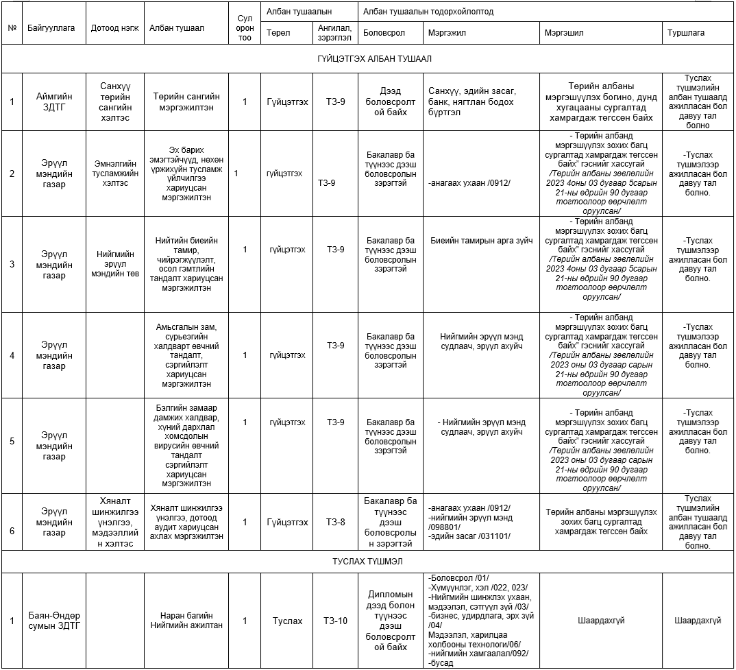 Төрийн албаны зөвлөлийн 2023 оны 25 дугаар тогтоолоор батлагдсан Төрийн албаны шалгалт өгөх болзол болон шатлан дэвшүүлэх, сонгон шалгаруулах журмын 4 дүгээр зүйлийн 4.2-т заасны дагуу төрийн өөр байгууллага, нэгж хооронд шилжин ажиллахыг хүссэн төрийн холбогдох бусад байгууллагад ажиллаж байгаа төрийн жинхэнэ албан хаагчдыг дараах албан тушаалд холбогдох материалаа цахим шуудангаар ирүүлэхийг урьж байна.