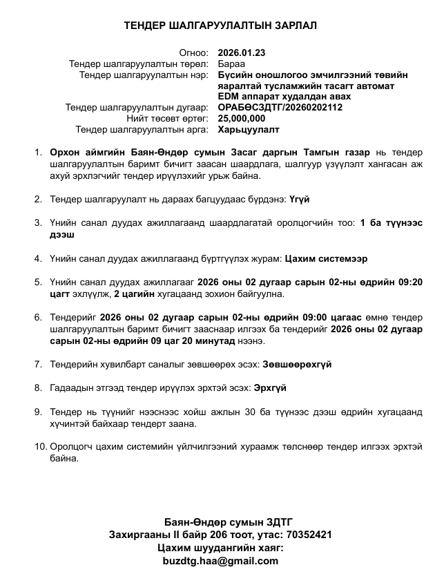 Тендер шалгаруулалтын зарлал