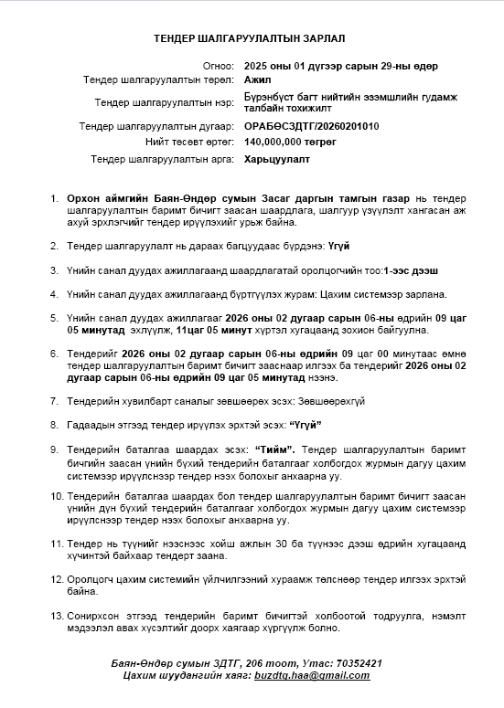 Орхон аймгийн Баян-Өндөр сумын Орон нутгийн хөгжлийн сангийн хөрөнгөөр санхүүжигдэх "Бүрэнбүст багт нийтийн эзэмшлийн гудамж талбайн тохижилт"-ын ажлын тендерийг тендер шалгаруулалтын харьцуулалтын аргаар зарлаж байна. Тус тендер шалгаруулалтын баримт бичигт заасан шаардлага, шалгуур үзүүлэлт хангасан оролцогчийг тендер ирүүлэхийг урьж байна.