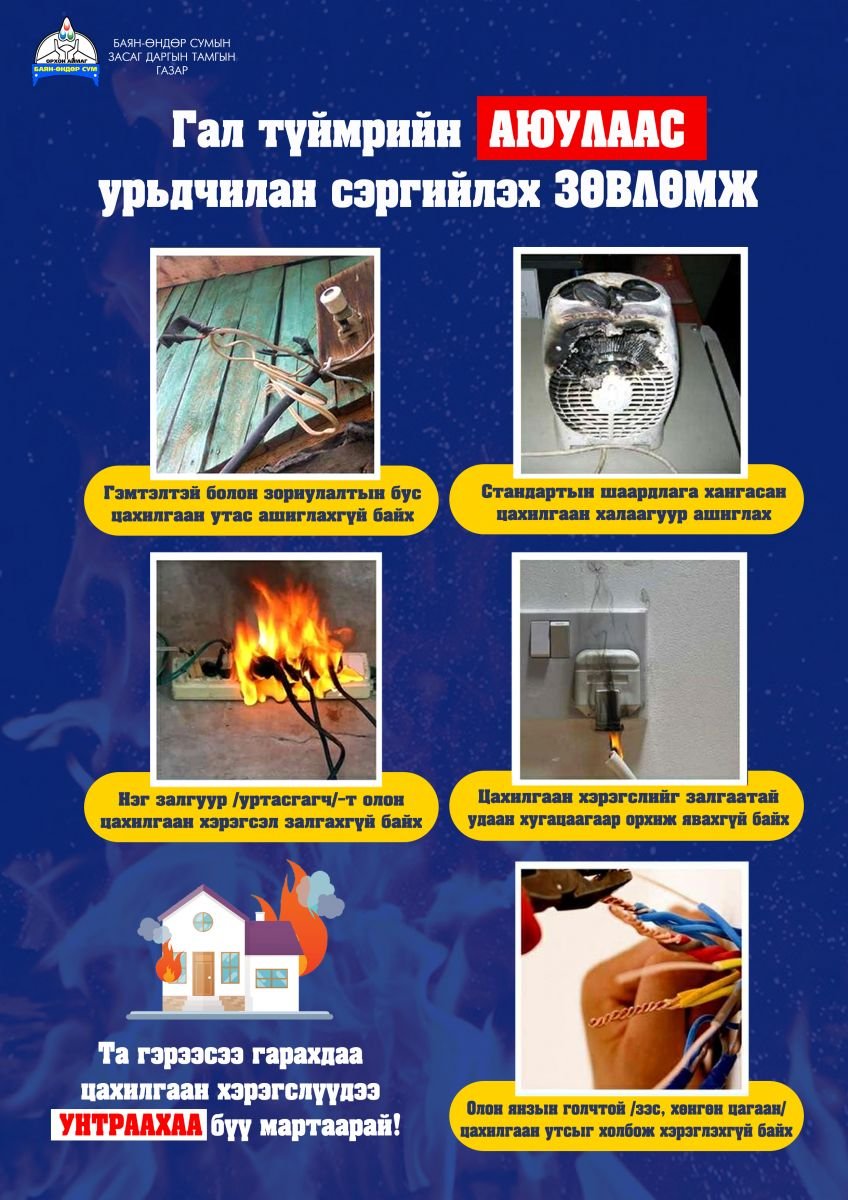 Иргэд цахилгааны хэт ачаалал /халуун тогоо, плитка, ус буцалгагч гэх мэт/ үүсгэх, шингэрүүлсэн шатдаг хий, пийшин зуухны аюулгүй байдлыг хангаж, ил задгай үнс нурам асгахгүй байх, тагтай төмөр зориулалтын саванд хийх, бага насны хүүхдийг хараа хяналтгүйгээр орхихгүй байх,
