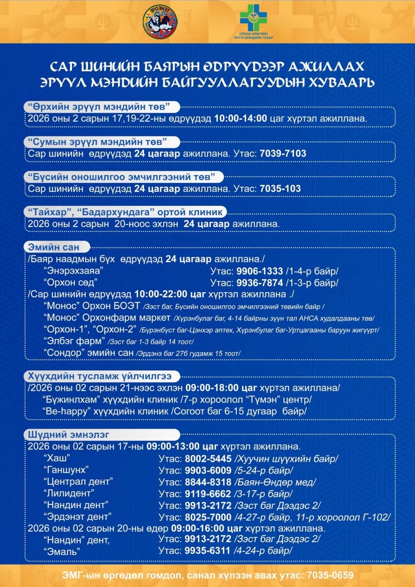 Сар шинийн баярын өдрүүдээр ажиллах Эрүүл мэндийн байгууллагуудын хуваарь