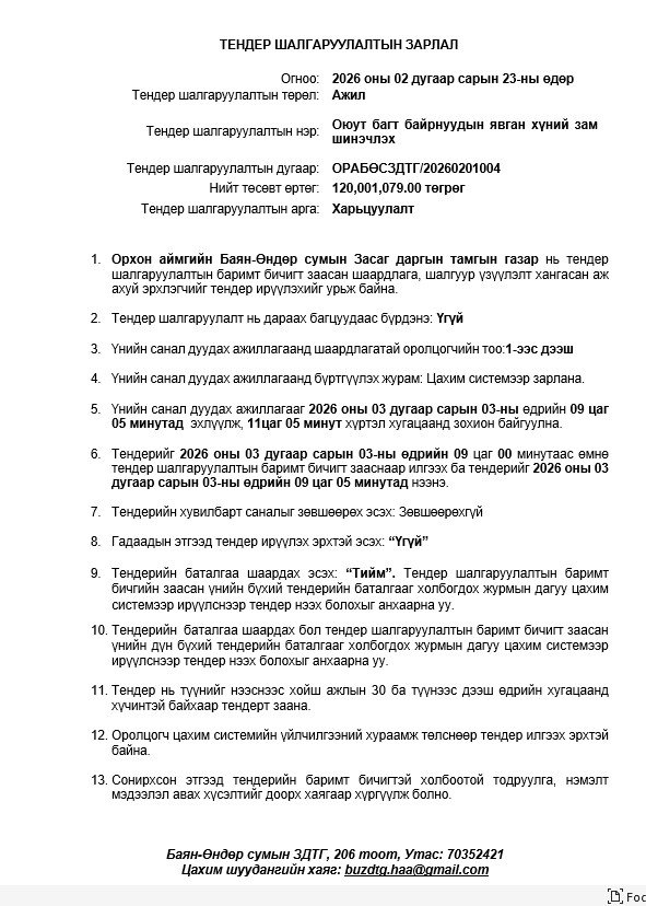 Орхон аймгийн Баян-Өндөр сумын Орон нутгийн хөгжлийн сангийн хөрөнгөөр санхүүжигдэх “Оюут багт байрнуудын явган хүний зам шинэчлэх ажил" -ын тендерийг тендер шалгаруулалтын харьцуулалтын аргаар зарлаж байна. Тус тендер шалгаруулалтын баримт бичигт заасан шаардлага, шалгуур үзүүлэлт хангасан оролцогчийг тендер ирүүлэхийг урьж байна.