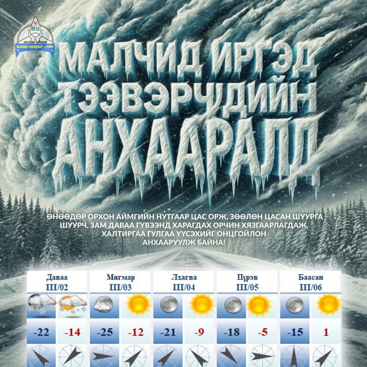 Орхон аймгийн нутгаар цас орж, зөөлөн цасан шуурга шуурч, зам даваа гүвээнд харагдах орчин хязгаарлагдаж, халтиргаа гулгаа үүсэхийг онцгойлон анхааруулж байна.