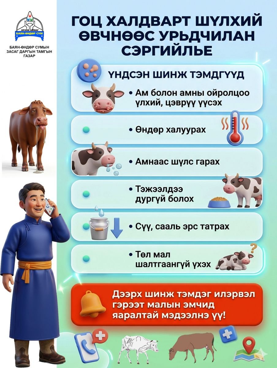 Дээрх шинж тэмдэг илэрвэл гэрээт малын эмчид яаралтай мэдээлнэ үү.