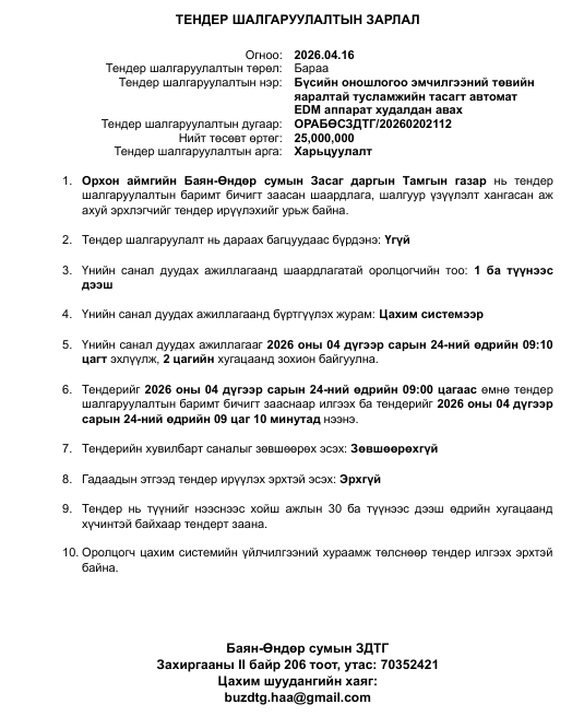 Тендер шалгаруулалтын зарлал
