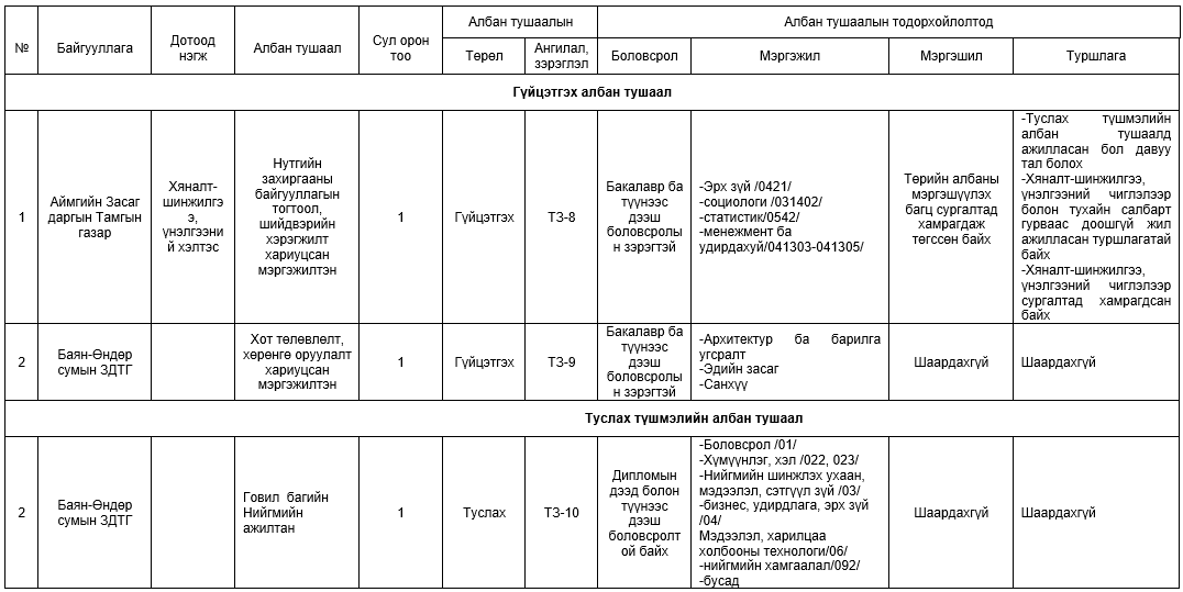 ТӨРИЙН ЖИНХЭНЭ АЛБАН ТУШААЛД ШИЛЖҮҮЛЭН АВАХ АЖЛЫН БАЙРНЫ ЖАГСААЛТ