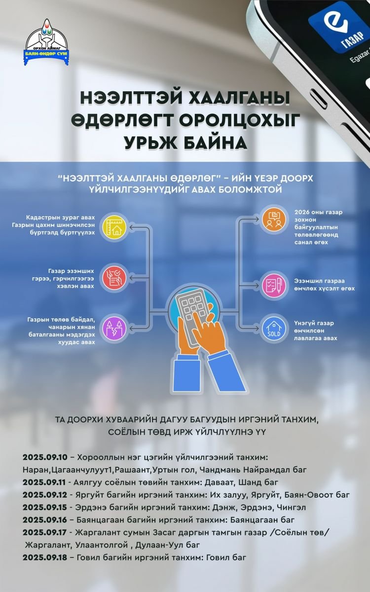 Газрын харилцаа, барилга, хот байгуулалтын газраас 2025.09.10–09.18 хүртэл “НЭЭЛТТЭЙ ХААЛГАНЫ ӨДӨРЛӨГ” зохион байгуулж байна.