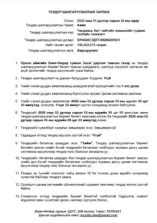 Орхон аймгийн Баян-Өндөр сумын Орон нутгийн хөгжлийн сангийн хөрөнгөөр санхүүжигдэх “андмань багийн нийтийн эзэмшлийн гудамж талбайн тохижилт" -ын ажлын тендерийг тендер шалгаруулалтын харьцуулалтын аргаар зарлаж байна. Тус тендер шалгаруулалтын баримт бичигт заасан шаардлага, шалгуур үзүүлэлт хангасан оролцогчийг тендер ирүүлэхийг урьж байна