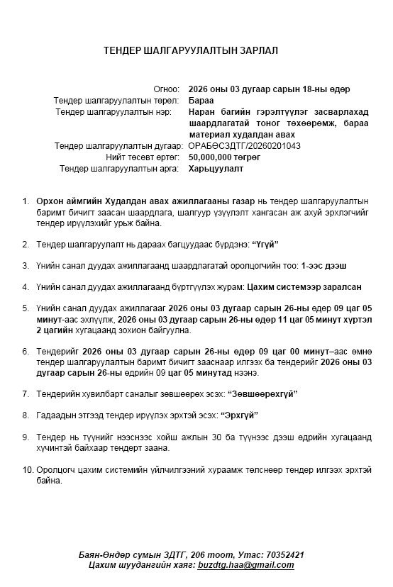 Орхон аймгийн Баян-Өндөр сумын Орон нутгийн хөгжлийн сангийн хөрөнгөөр санхүүжигдэх "Наран багийн гэрэлтүүлэг засварлахад шаардлагатай тоног төхөөрөмж, бараа материал худалдан авах” тендерийг харьцуулалтын аргаар зарлаж байна. Тус тендер шалгаруулалтын баримт бичигт заасан шаардлага, шалгуур үзүүлэлт хангасан оролцогчийг тендер ирүүлэхийг урьж байна.