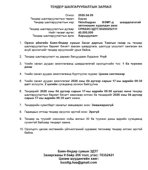 Тендер шалгаруулалтын зарлал
