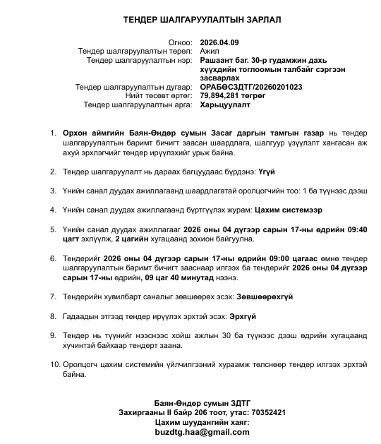 Тендер шалгаруулалтын зарлал